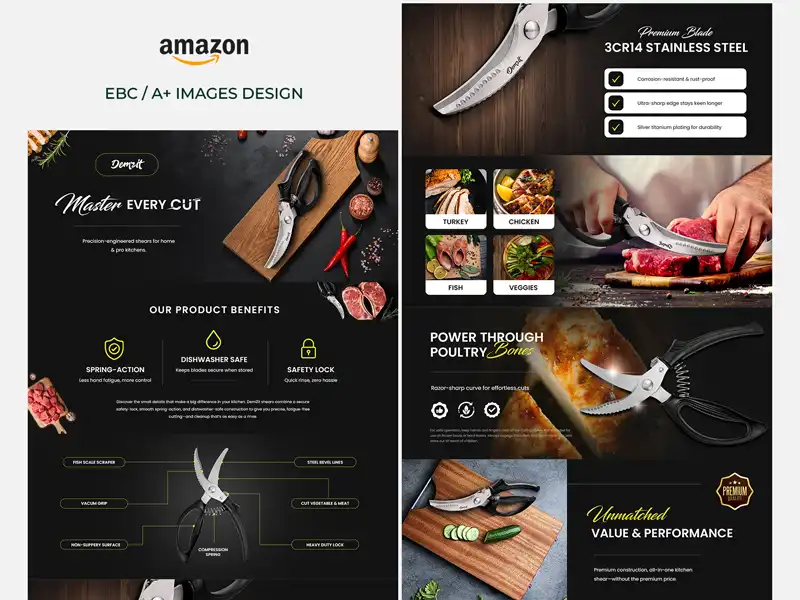 Branded A+ Content (EBC) designs that enrich product detail pages and help increase conversions with compelling visuals and storytelling.